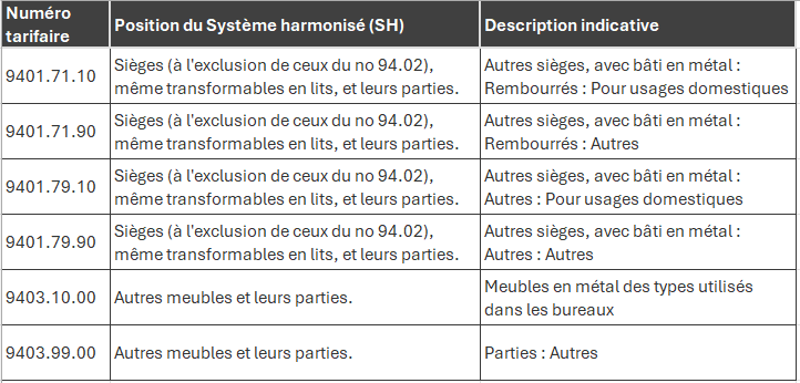 Dans le but de stabiliser certains secteurs clés, de stimuler l’utilisation de produits fabriqués au Canada, et de répondre à l’évolution des marchés internationaux, le gouvernement du Canada a annoncé la mise en place de certaines mesures tarifaires. Dès le 26 décembre 2025, le gouvernement imposera des droits de douane de 25 % sur la valeur totale des produits dérivés de l’acier énumérés ci-dessous en provenance de tous les pays. Plusieurs codes SH commençant par 9401 et 9403 (meubles) font partie de cette liste.